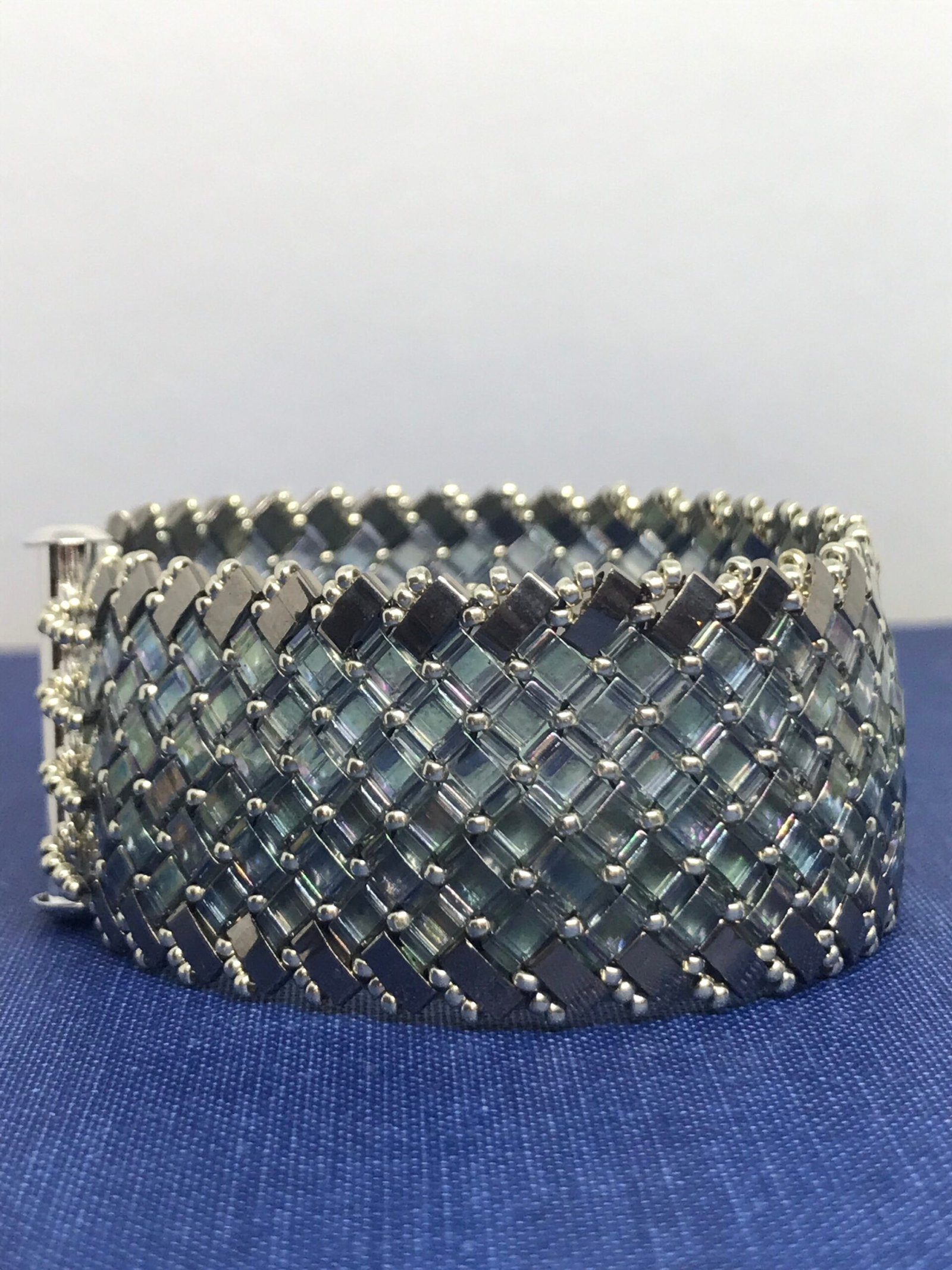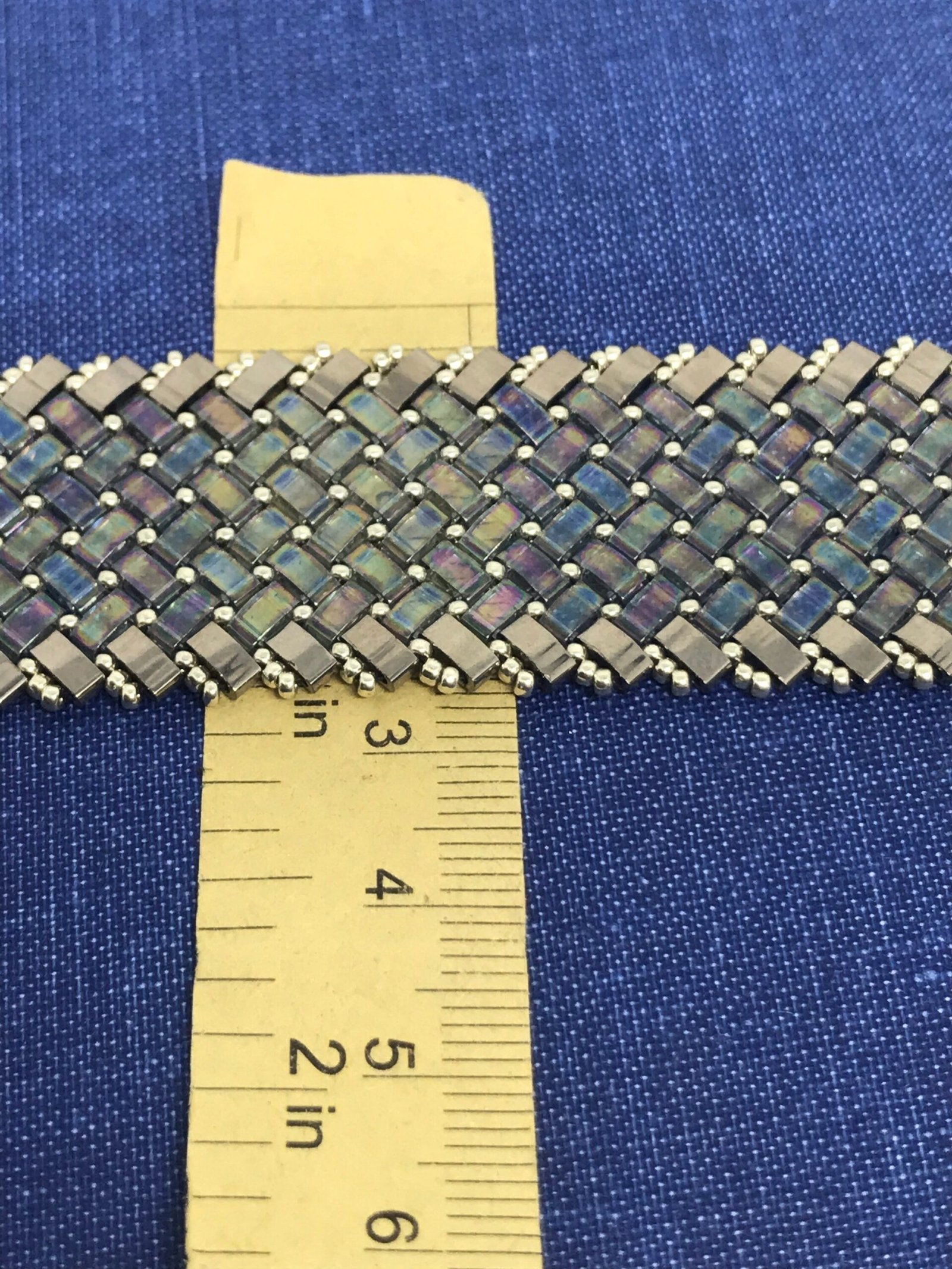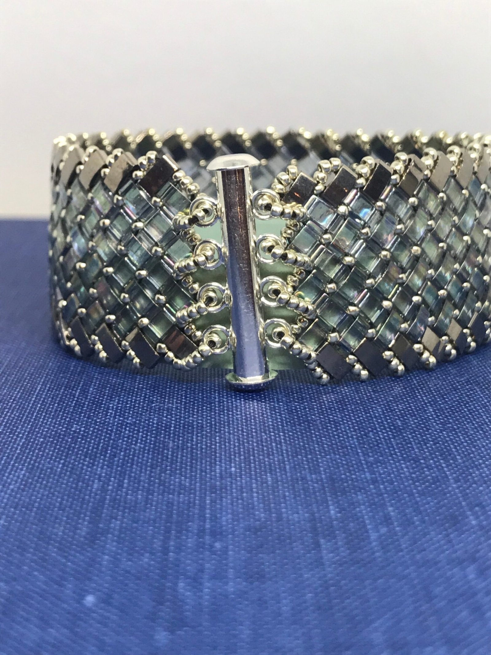 This bracelet is absolutely beautiful, it is woven in a herringbone pattern with half tila glass beads which give it a smooth fluid feel.