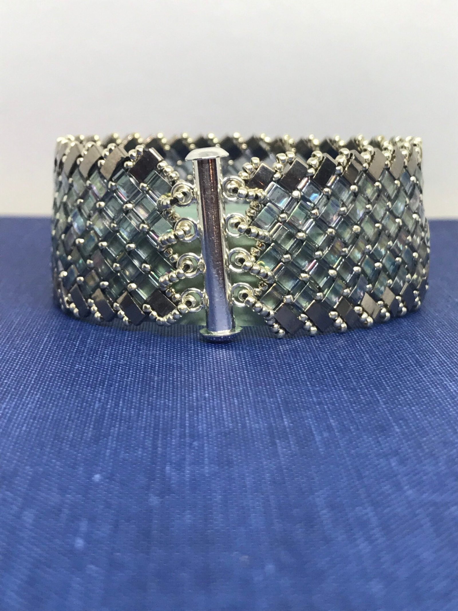Made from Miyuki translucent grey and accented with silver half tila glass beads with silver seed beads. The bracelet is finished with a silver slide lock clasp.