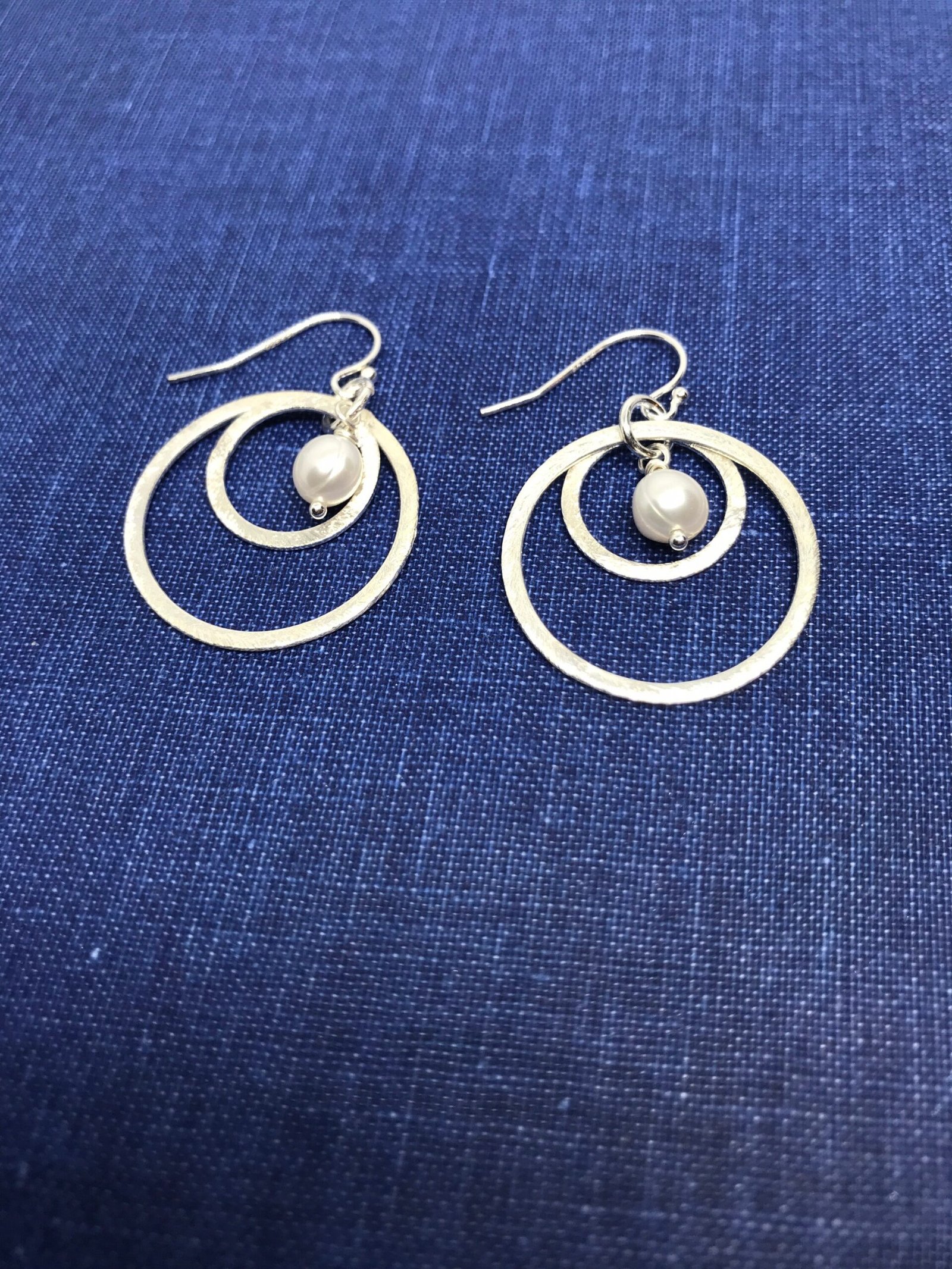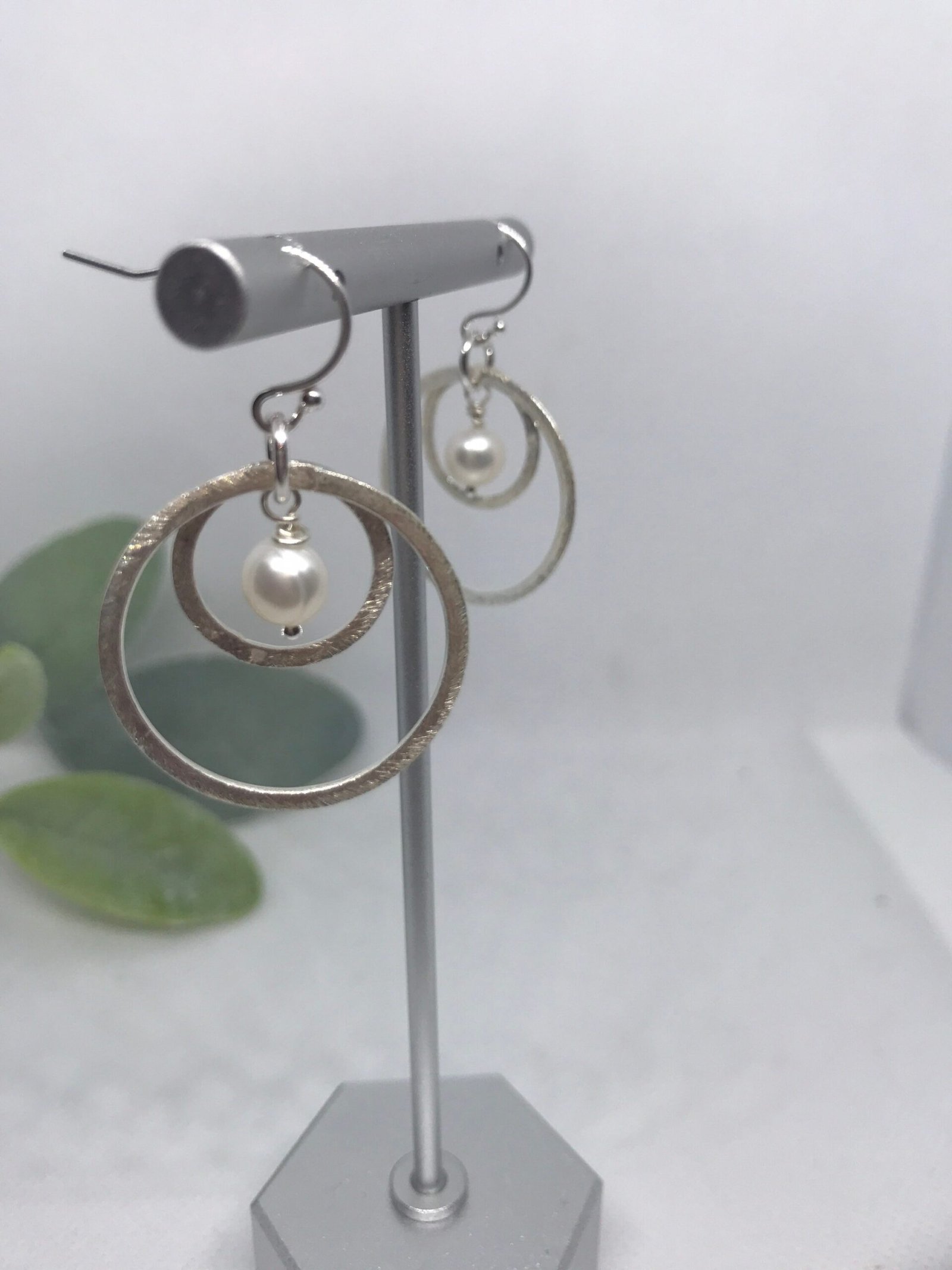 I love these earrings! So simple yet elegant. They consist of two sterling silver circles with a Pearl dangling in the middle.