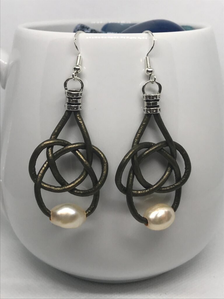 Celtic Knot Earrings with Olive Green Leather with a Pearl
