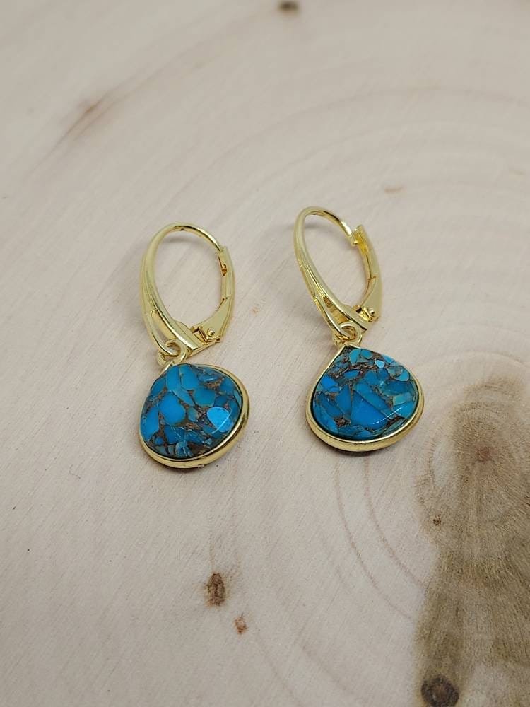 Turquoise bezel earrings with sterling silver gold plated leverback earwires