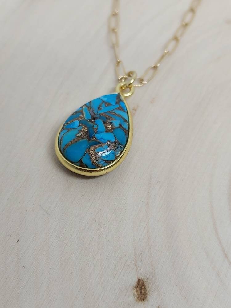 18″ gold plated necklace with turquoise bezel teardrop stone